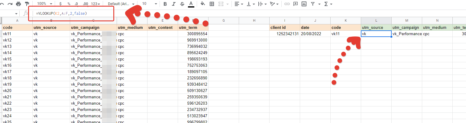 Получится, что у нас будут два массива данных с одинаковым ключом. Поэтому ключу мы и сможем связать эти таблицы, выводя к таблице с заявками через функцию ВПР нужные параметры utm из справочной таблицы.