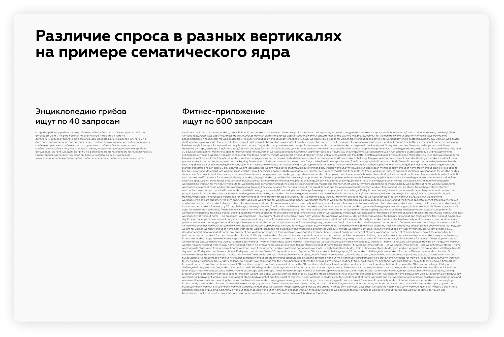 Разберем на примере. Чтобы найти энциклопедию грибов, пользователи могут использовать около 40 ключевых запросов. Тематика узкая, и язык, с помощью которого её можно описать, ограничен: вариантов вроде «грибы», «грибник», «справочник по грибам» просто не так много. Так что 40 запросов — максимальный объём спроса.