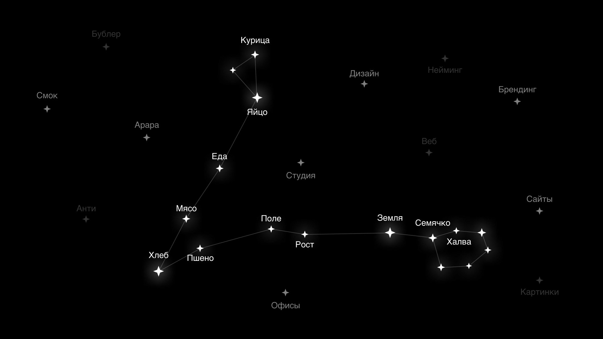 Здесь начинается самое интересное. Слова как звезды в ночном небе: загораются и гаснут. Чтобы эти звезды как-то структурировать, мы рисуем для них карту ассоциаций, выделяем созвездия.