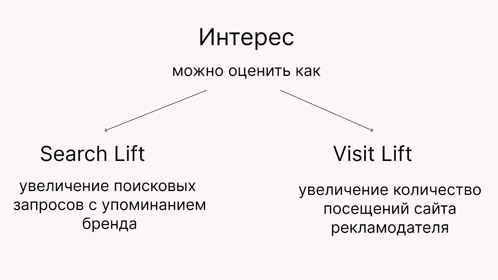 Интерес разделяется на Search Lift и Visit Lift. Рассмотрим каждую составляющую подробнее. Но заранее оговорюсь, что если каждый из этих показателей будет низким, это указывает на необходимость изменения креативов, таргетинга или выбора площадок. Высокий, в свою очередь, свидетельствует об успешности используемой стратегии и оправданности инвестиций в медийную рекламу.