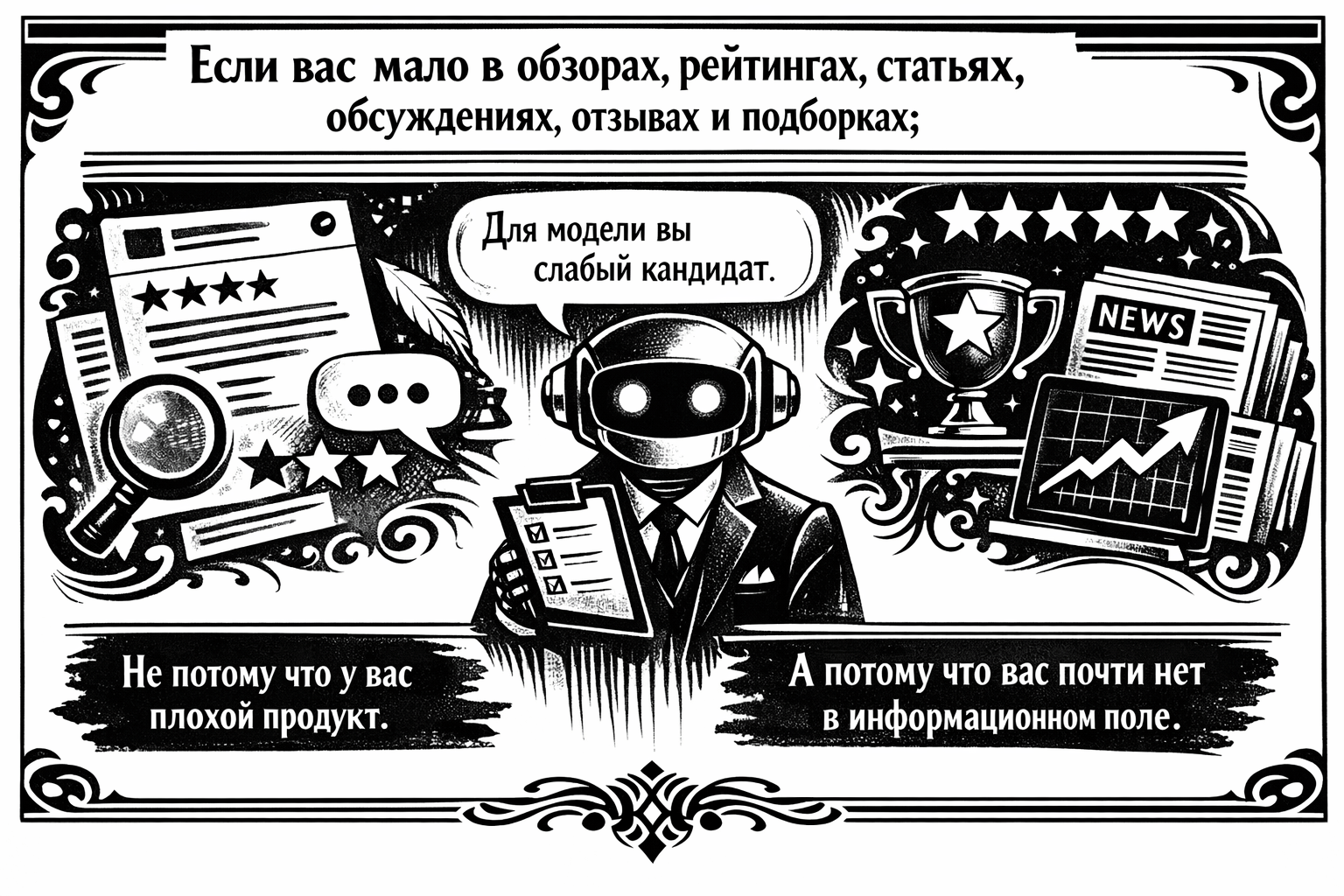Если вас мало в обзорах, рейтингах, статьях, обсуждениях, отзывах и подборках, то для модели вы слабый кандидат.