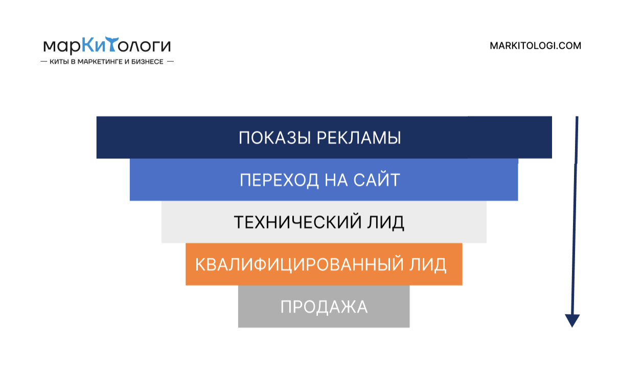 Воронка для отчета по регулярному менеджменту будет выглядеть так: показ рекламы ---> клик по рекламе (переход на сайт) ---> технический лид (оставил заявку) ---> квалифицированный лид (качественная заявка) ---> продажа