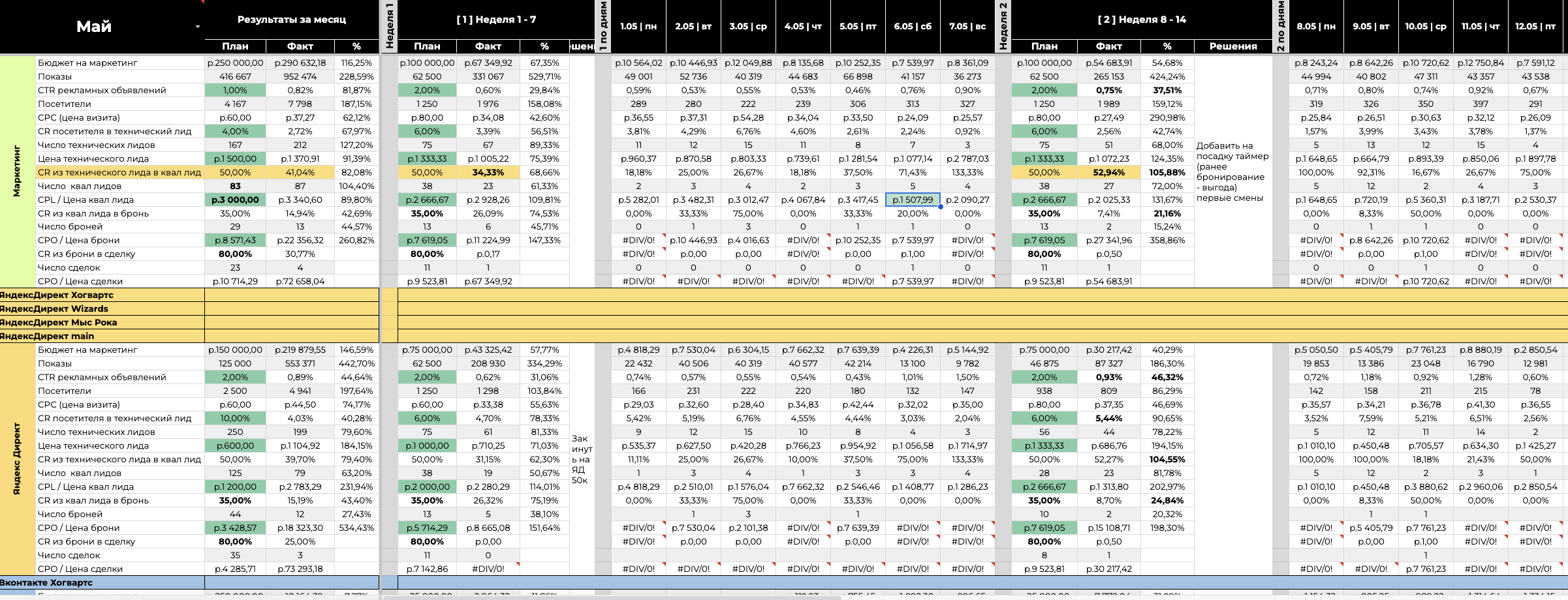 Я надеюсь у вас у всех в бизнесе выстроен процесс оцифровки и внедрен регулярный менеджмент. Это такой ежедневный отчет в формате огромной таблицы exel, в который ваши специалисты из маркетинга и отдела продаж ежедневно заносят значения ключевых показателей за предыдущий день. Например у нас в агентстве есть правило заполнять этот отчет до 11 часов утра, чтобы весь день можно было работать с показателями.