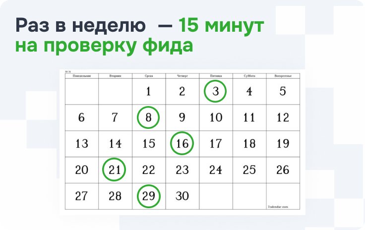 Проверка фида — не разовая акция перед запуском кампании. Это регулярная рутина, как сверять кассу или смотреть еженедельные отчеты. Простой регламент: