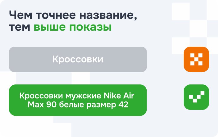 Название — то, по чему вас находят в поиске. «Кроссовки» — плохо. «Кроссовки мужские Nike Air Max 90 белые размер 42» — хорошо. Больше конкретных деталей — выше шанс показа по точному запросу. «Яндекс» любит подробные названия, они влияют на ранжирование.