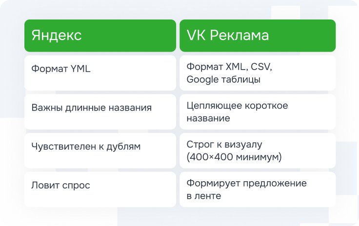 Один фид на все случаи жизни — опасный миф. Идеально работает в «Яндексе» — не подойдет VK, и наоборот. Разберем различия подробнее.