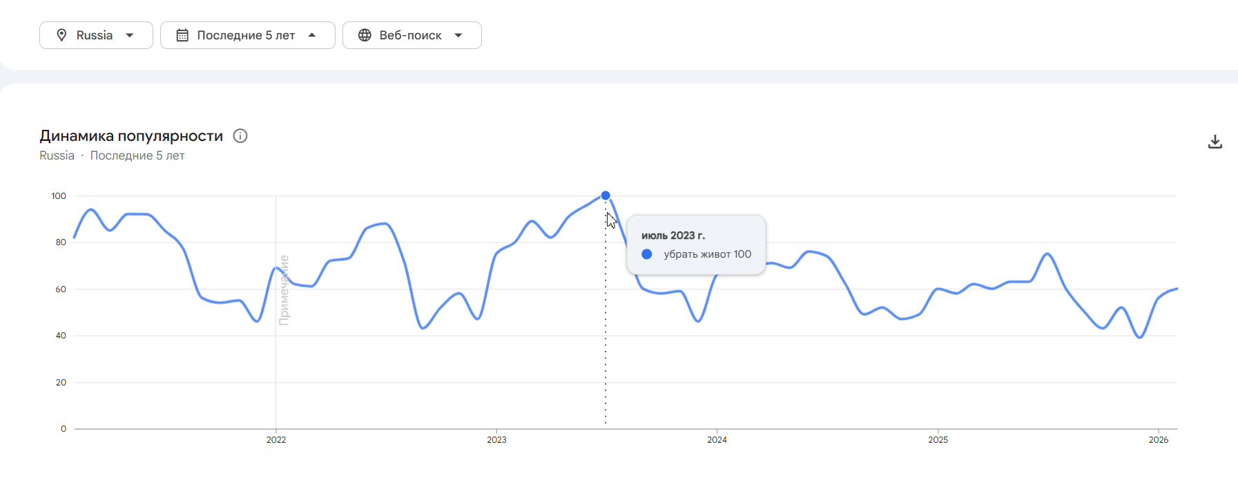 Google Trends — инструмент для поиска актуальных трендов и запросов в зависимости от инфоповодов, обстановки в стране и мире, сезонности. Например, пик запросов «убрать живот» приходится на март и середину лета.
