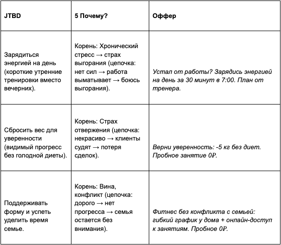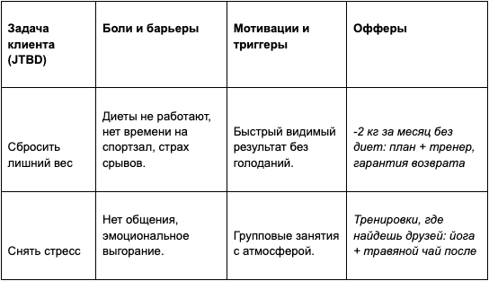 Клиент покупает (заказывает) ваш товар (услугу) для работы — убрать боль, достичь цели. Например, одни мужчины ~30 лет, которые ищут фитнес-центр, борются с усталостью после работы через физнагрузки, другие — хотят нарастить массу.