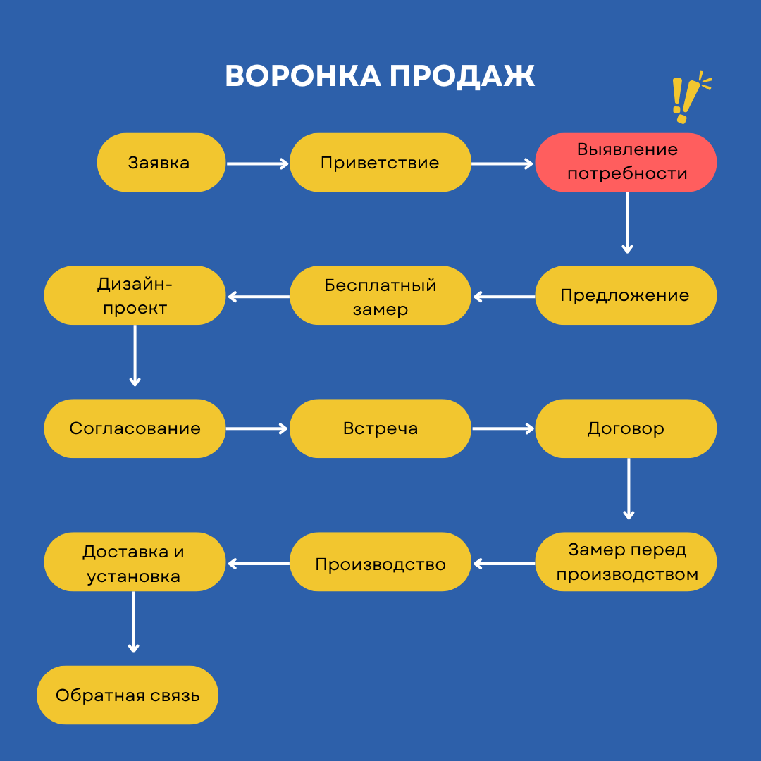 5. Бесплатный замер: Продаем выезд замерщика или встречу. Не для всех очевидны преимущества этого мероприятия. И это отдельный этап воронки, который или переведет человека на ключевой этап или закончит с ним диалог. (На этом шаге чаще всего и происходят срывы конверсий, так как менеджер по продажам не уделяет ему должного внимания)