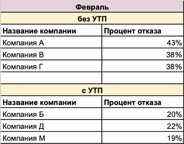 Компании с чётко сформулированными УТП, имеют процент отказов ниже в два раза, получают больше качественных лидов