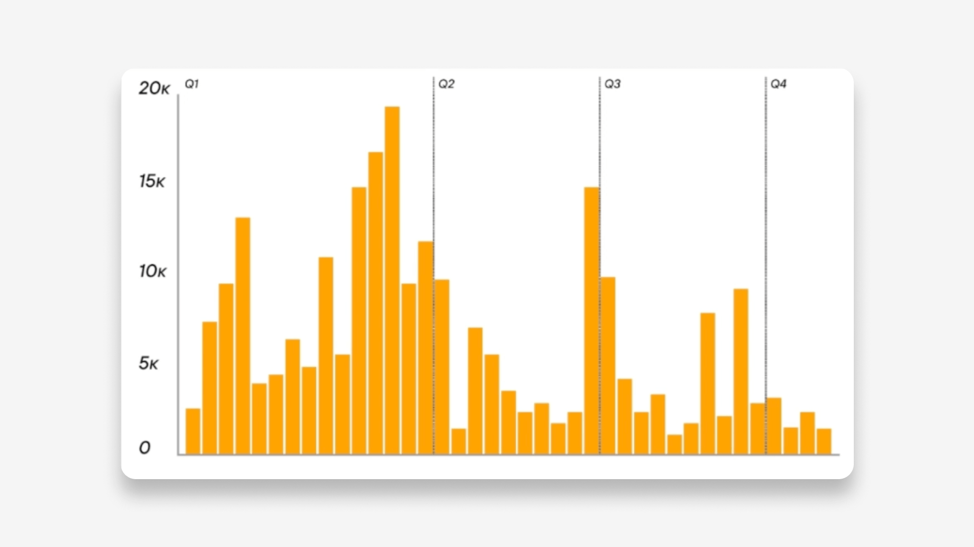 И для наглядности еще один график — охваты по нашим статьям за 2023 год, по кварталам. Видно, что в первом квартале все хорошо, а во втором охваты упали почти в три раза. При этом в наших статьях ничего не менялось: писали те же ребята, Паша Молянов и Илья Еремин, выбирали интересные темы и хорошо их отрабатывали. Проблема была явно не в контенте — что-то произошло с площадкой.