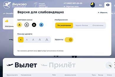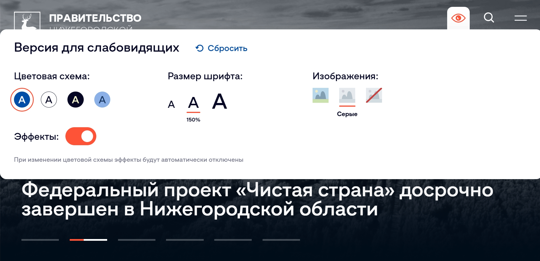 Мы в Riverstart обычно используем версию для слабовидящих с широкими настройками. Она не только позволяет увеличить текст, но также и выбрать альтернативную цветовую схему: минималистичную, темную или в синих тонах, отключить визуальные эффекты и настроить изображения.
