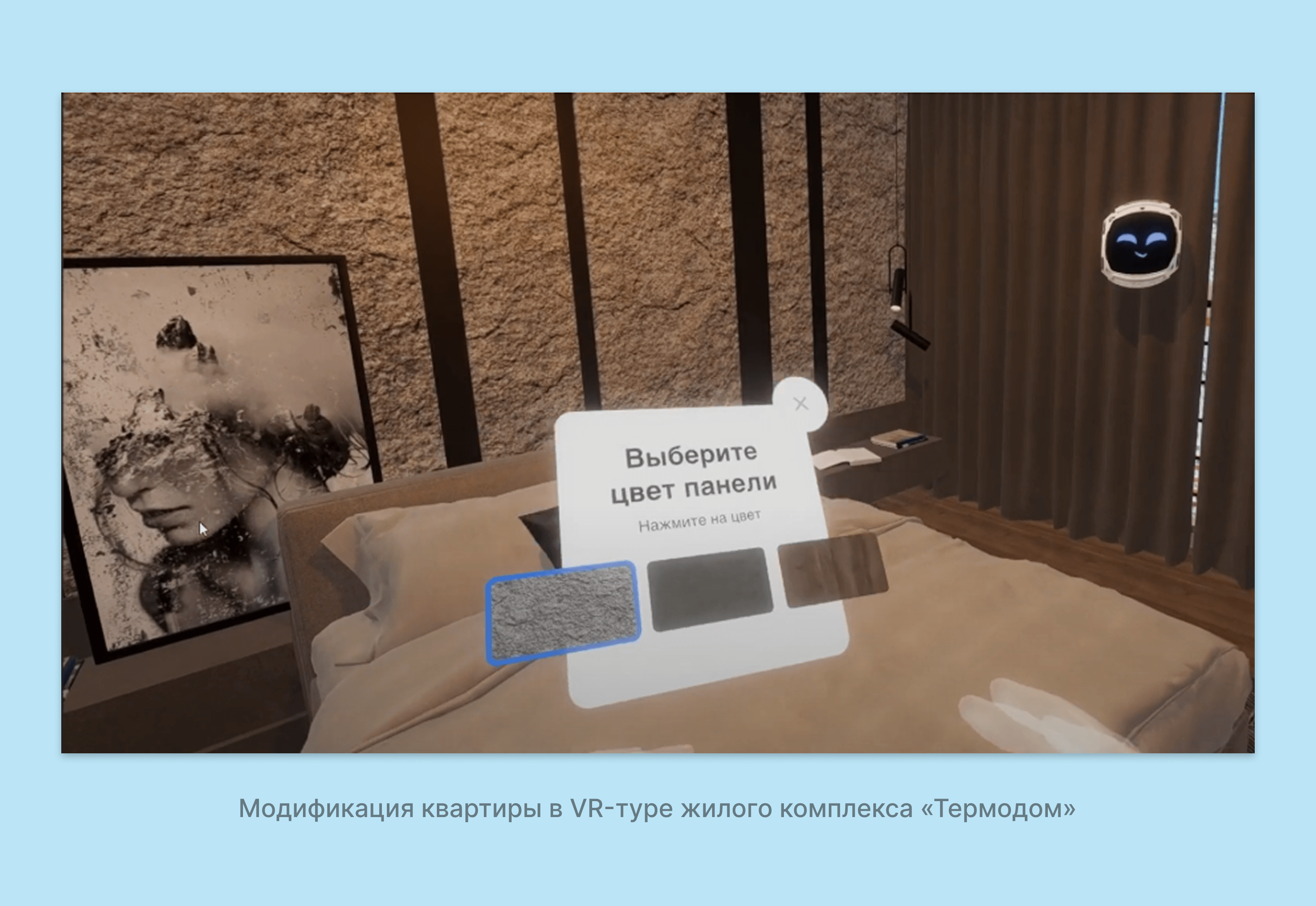 Результатом стал 10‑минутный VR‑тур. С помощью VR-очков Oculus Quest 2 клиент может зайти в холл, пообщаться с консьержем, а также подняться на 24‑й этаж и изучить планировку трехкомнатной квартиры и вид из окна. Для интерактива добавили смену цвета стен и фотообоев, а также функцию «полета» над микрорайоном.