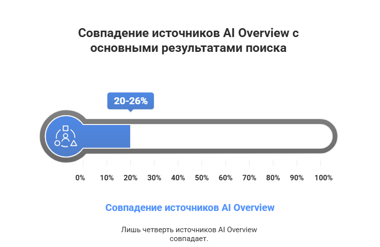 По данным исследования Semrush, проведённого в начале 2025 года, AI-сводки в среднем содержат около 11 ссылок на источники, хотя в некоторых случаях их количество может достигать 302. Однако самое интересное заключается в том, что лишь 20–26% этих ссылок совпадают с сайтами из ТОП-10 традиционной органической выдачи. Это означает, что AI Overviews функционирует по собственной логике отбора источников, которая не всегда коррелирует с классическим ранжированием по PageRank.