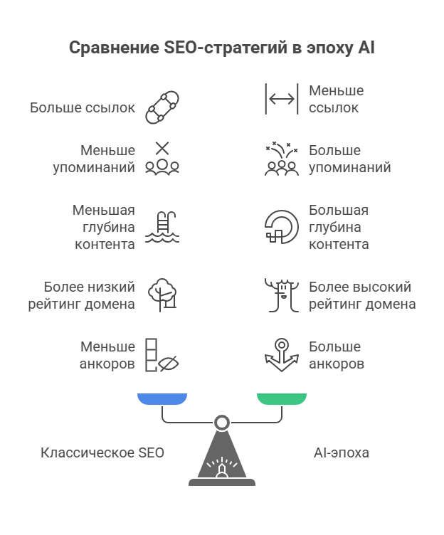 Массовые, шаблонные и манипулятивные методы линкбилдинга не просто неэффективны для AI-видимости — они активно фильтруются. Единственный путь — естественные редакционные ссылки и органический рост упоминаемости.