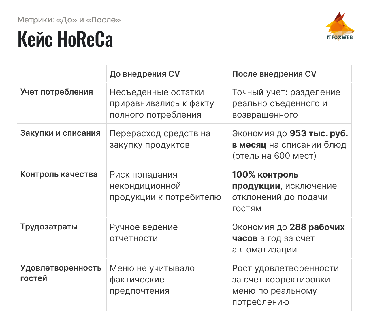 Решение:Внедрение системы автоматизированного контроля Foodbox с модулем компьютерного зрения позволило разделять реально съеденное и возвращенное. Это дало возможность точно анализировать вкусовые предпочтения гостей, обоснованно корректировать ассортимент и рационально планировать закупки.