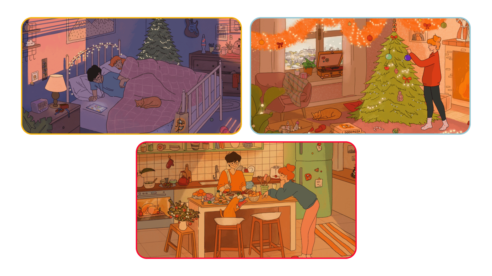 Пример отличного новогоднего поздравления — плейлист от Додо, который бренд подарил всем своим поклонникам, а мы проиллюстрировали и сделали анимацию для lofi стрима. Казалось бы, простая штука, а какая приятная. Плейлиста у нас не сохранилось, а как всё выглядело можно посмотреть.
