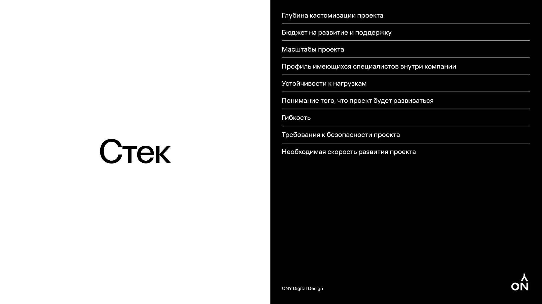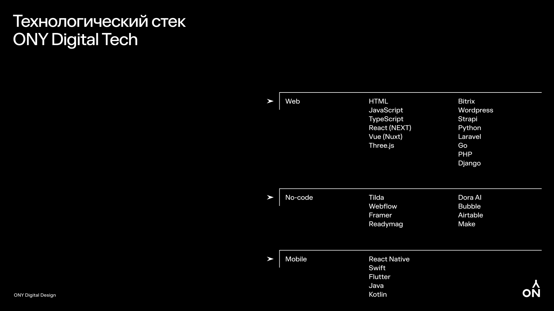 В первую очередь, ONY Digital Tech — это экспертность и индивидуальный подход. Мы учитываем особенности конкретного проекта, бизнес-процессы и наличие у клиента собственной команды разработки. Исходя из этих параметров, подбираем оптимальное решение, как с точки зрения стека, так и методологии ведения проекта.Руслан Гончаров, Group Head of New Business в ONY