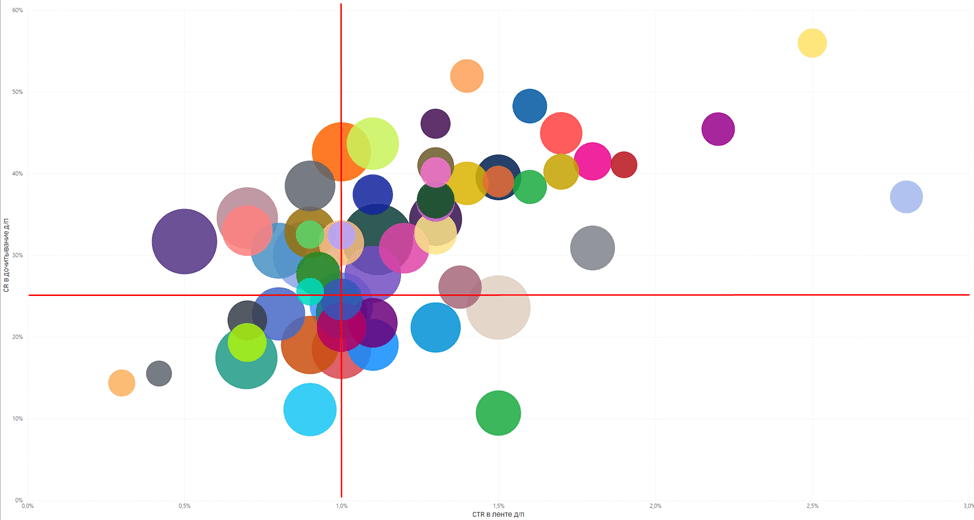 Для анализа статей в разрезе двух метрик удобно использовать пузырьковые диаграммы, где ось Х это CTR, а ось Y Конверсия (CR) в Дочитывания.Размер пузырьков может описывать количество показов статей.