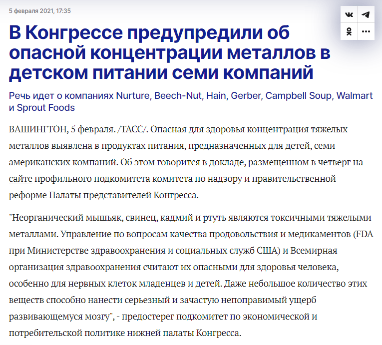 Пример — скандал с тяжелыми металлами в детских смесях. История началась с видео в TikTok, где девушка проверила смеси Gerber и обнаружила частицы, реагирующие на магнит. Эксперимент стали повторять другие пользователи, в соцсетях поднялась волна возмущения. Тему быстро подхватили СМИ: ТАСС, РИА Новости, «Коммерсант» писали, что в детской смеси нашли неорганический мышьяк, свинец, кадмий и ртуть, опасные для развития малыша. Новость шокировала западное и российское сообщество.
