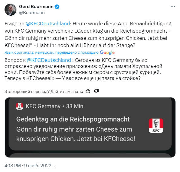 Затрагивать темы религии, внешности, гендерных различий, социальные проблемы и проблемы неравенства — ходить по лезвию ножа. В отдельных случаях причиной скандала служит банальная невнимательность. Так, бот KFC предлагал немцам отметить годовщину «Хрустальной ночи» хрустящей курочкой.