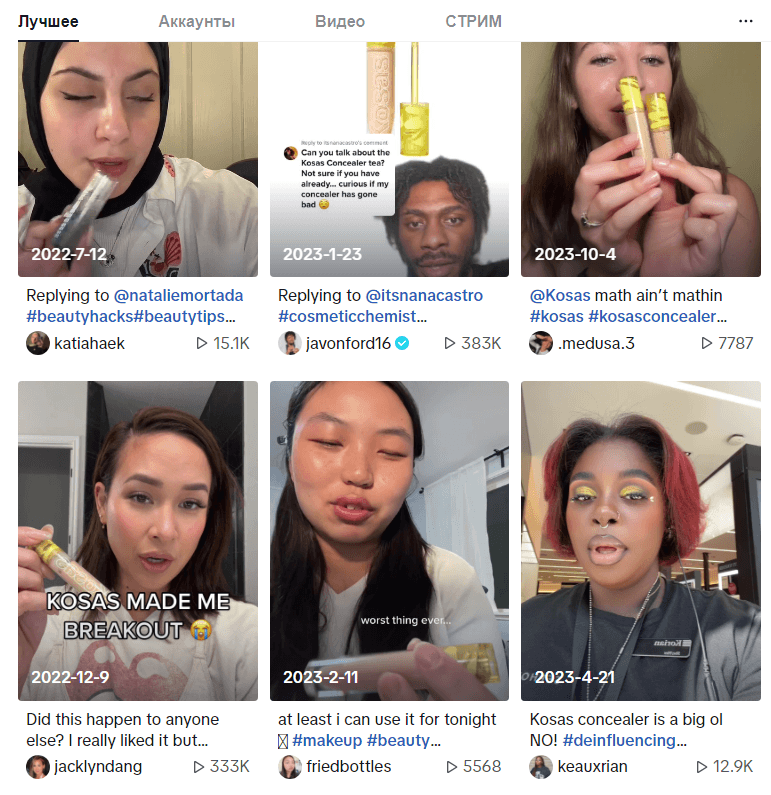 Также поступил косметический бренд Kosas, который в 2022 году обвинили в продукции низкого качества. Консилер бренда пах «голубым сыром», внутри развивалась плесень. Некоторые клиенты жаловались на сыпь после применения продукта. Тему активно обсуждали в TikTok и на Reddit.