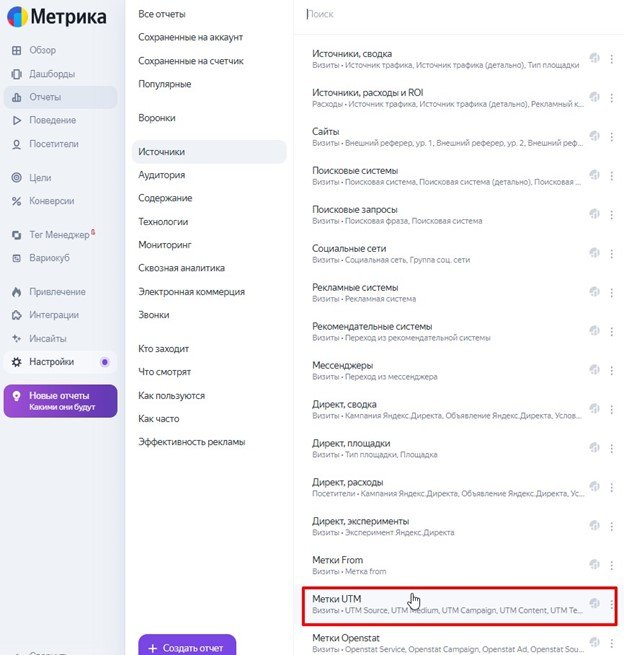 В Яндекс. Метрике есть специальный отчет «Отчеты → Источники → Метки UTM», который содержит детальный анализ по каждой метке.