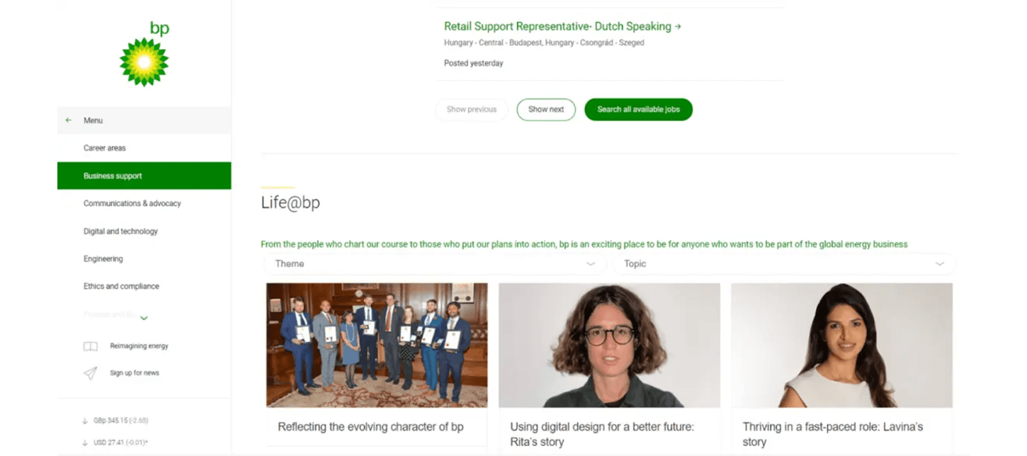 Хорошо, если для каждого направления будет отдельный лендинг с универсальной структурой, где будут ссылки на вакансии и, например, истории успеха — как на сайте транснациональной нефтегазовой компании BP, который мы нашли во время исследования рынка: