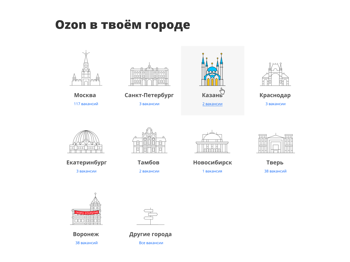 Обычно в крупных компаниях есть несколько направлений, которые занимаются самыми разными задачами. Например, на карьерном портале для Ozon, который мы делали, есть разделение по шести направлениям: IT, логистика, фулфилмент, маркетинг, финансы и коммерция.