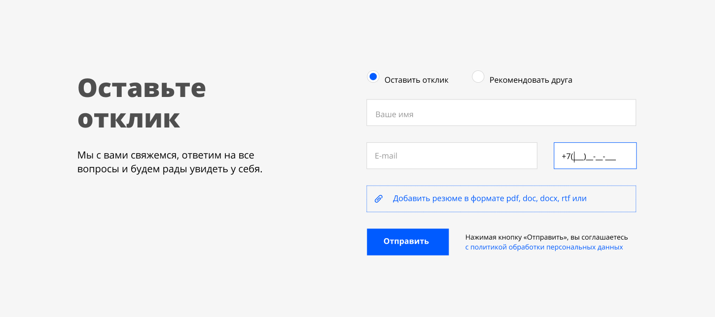 Обычную форму тоже стоит предусмотреть. А если в компании есть реферальная программа — сотрудники могут предложить кандидата и получить бонус, — то еще стоит добавить форму рекомендации друга.