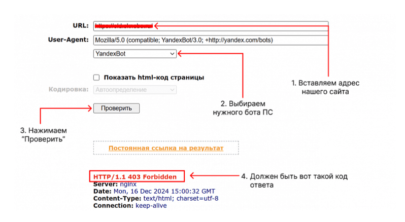 После добавления правил в файл обязательно проверьте какой код ответа получают роботы Яндекс и Google, для этого используйте сервис Bertal (как пользоваться программой →). Если вы всё сделали правильно, то вам отобразится 403 ответ (доступ к запрошенному ресурсу запрещён).