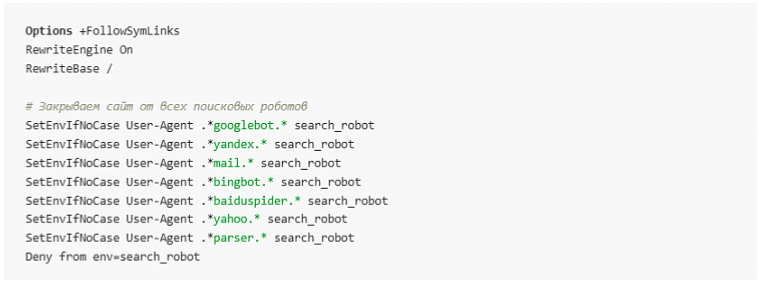 Файл .htaccess используется для настройки поведения веб-сервера Apache. С его помощью мы закроем доступ к сайту так, что роботам будет показываться код ответа 403.