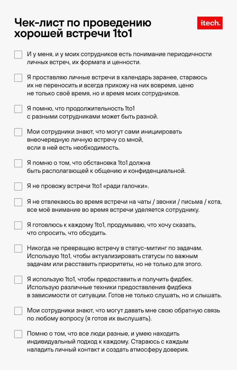 Встречи 1to1 — неформальное и регулярное общение руководителя с сотрудником тет-а-тет. Во время таких встреч происходит обмен обратной связью и обсуждаются возможные проблемы в работе. Регулярные личные встречи — отличный способ показать, что ты ценишь тех, кто работает с тобой, и готов уделять им свое время.