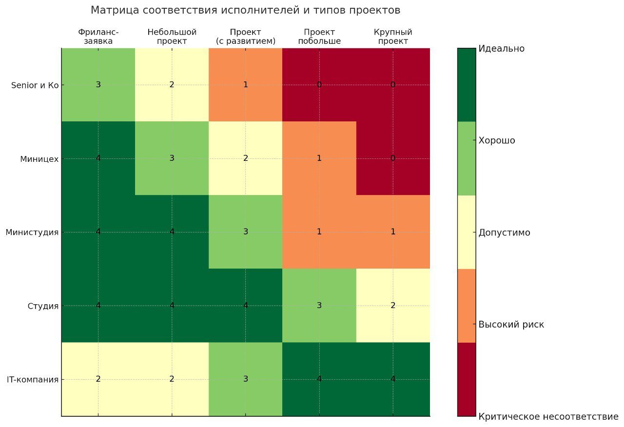 Не существует «идеального подрядчика вообще» — существует подходящий подрядчик под конкретный проект. Баланс важен по трём осям: