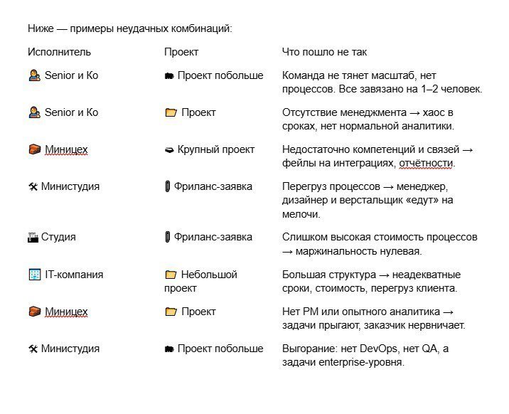 Когда бизнес обращается за IT-услугой — разработкой сайта, системы или приложения — он зачастую не осознаёт, что под капотом каждой команды лежит своя производственная модель. И она должна соответствовать не только бюджету, но и типу задачи, скорости реакции, требуемой глубине проработки и даже частоте изменений.Попытка передать проект, требующий сложной координации и проверок, одному фулстек-разработчику — так же неэффективна, как пытаться строить каркасный дом с помощью одного плотника: он-то может, но сроки и качество будут под вопросом.С другой стороны, привлечение целой студии к простому лендингу за 50 тысяч — это как вызывать строительную бригаду с прорабом и архитектором для того, чтобы забить один гвоздь. Затратно, неэффективно и приведёт к избыточному «оверхеду» на каждый этап: проектирование, согласование, отчётность.