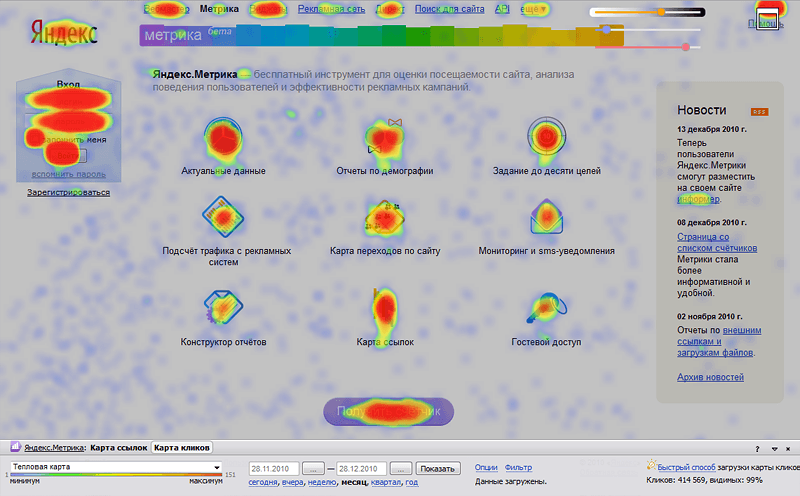 Тепловая карта и карта кликов показывают, на какие части страницы пользователи кликают чаще всего.