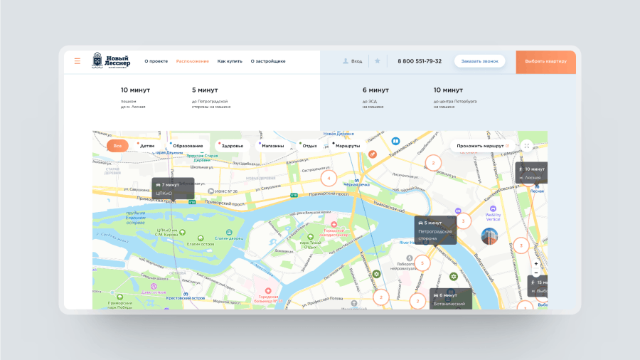 Похожую реализацию интерактивной карты можно увидеть на сайте ЖК «Новый Лесснер». Объекты инфраструктуры здесь так же разделены на несколько наиболее важных и популярных категорий: «Детям», «Образование», «Здоровье», «Магазины», «Отдых», «Маршруты». Это отличный способ разгрузить карту и помочь пользователю быстрее понять, насколько район удобен именно для него.