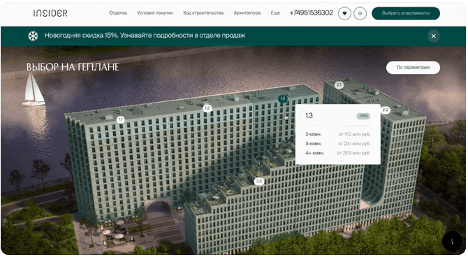 Московский ЖК Insider и астраханский ЖК «Атмосфера» нашли схожие решения для этого: посетителю сайта предлагается поочередно выбрать желаемый корпус, этаж, квартиру. Щелкнув на один из изображенных на экране домов, пользователь «проваливается» в выбор этажа, а затем и квартиры — напоминает небольшую игру, в которой каждый клик приближает к желанной цели. Выбор жилья — ответственный и напряженный шаг, а легкий интерактив снимает эту нагрузку и делает процесс приятным.