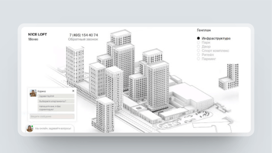 Впечатляющий пример я нашел на сайте ЖК N`ice Loft — спортивного комплекса апартаментов. Все важные здания ЖК — физкультурно-оздоровительные центры, ледовые арены, парковки, парки, коммерческие площади, отели — можно представить вживую благодаря интерактивной 3D-модели.