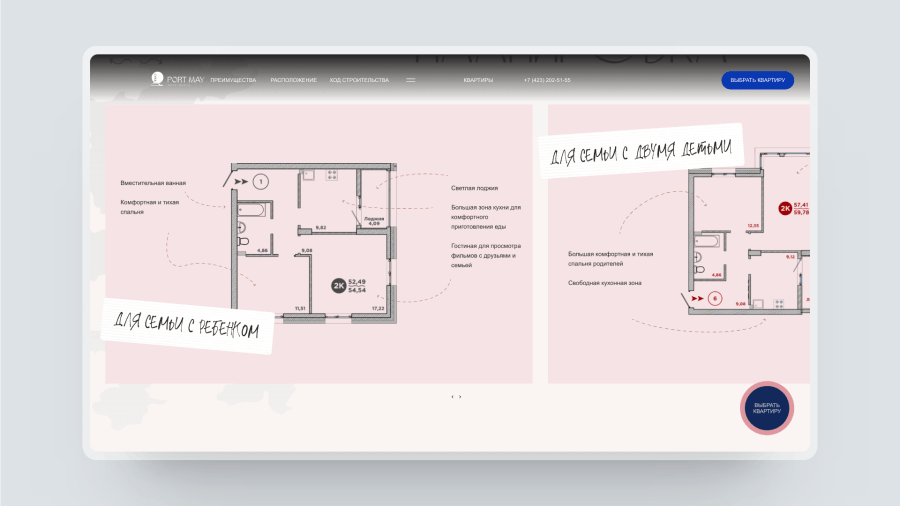 Подобное решение можно увидеть и на сайте владивостокского ЖК Port May. На чертежи добавлены надписи о том, для кого подойдет та или иная планировка: «Для молодой пары», «Для семьи с ребенком» или «Для семьи с двумя детьми», а также в чем преимущества каждой комнаты: «Комфортная и тихая спальня», «Гостиная для просмотра фильмов с друзьями и семьей» и т. п.
