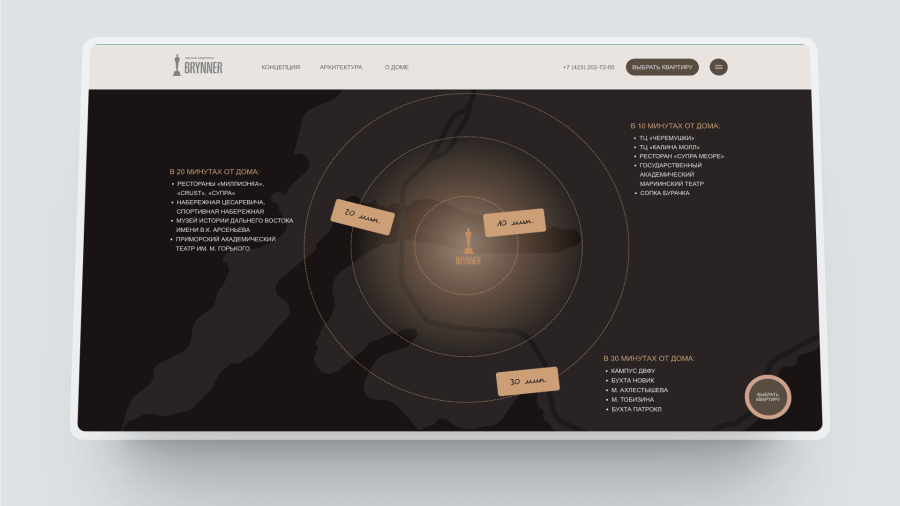 Не картой единой — инфраструктуру можно показать и другими, оригинальными способами. Например, на сайте для владивостокского ЖК «Бриннер» расположение объектов рядом с домом изображено в виде концентрических кругов. В центре схемы находится сам жилой комплекс, на первом круге — объекты в десяти минутах от него, на втором — в двадцати, на третьем — в тридцати. Сама карта местности тоже присутствует — если приглядеться, ее можно увидеть на заднем фоне — но она не выбивается из общей цветовой гаммы и не создает лишнего шума нагромождением других объектов. Такое решение также может подойти, если на создание полноценной карты нет времени и ресурсов.