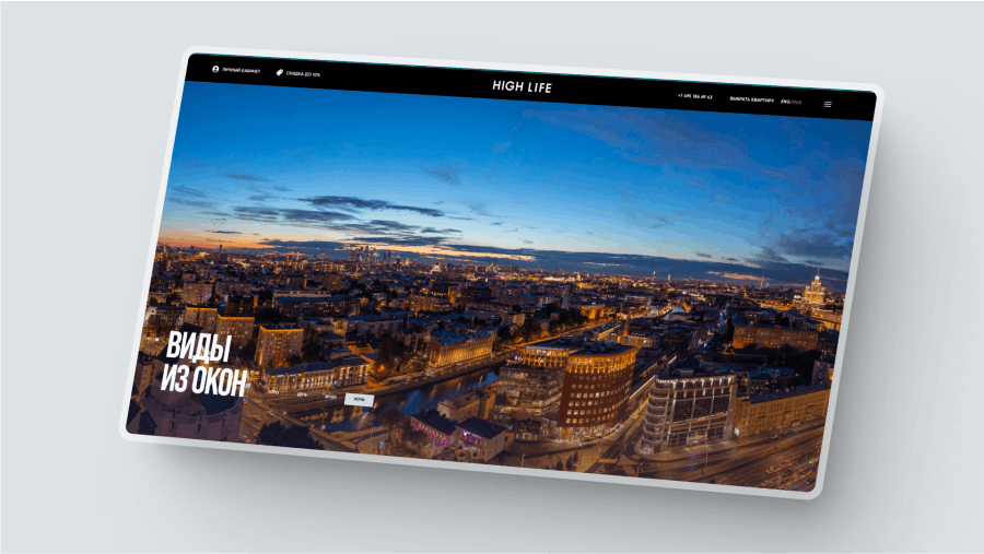 Можно тысячу раз написать «потрясающий вид из окна», но лучше один раз показать. Например, жилой комплекс премиум-класса «High Life» в Москве состоит из 6 башен, в самой высокой из которых — 47 этажей, и виды, открывающиеся с такой высоты, действительно впечатляют. Кликая по кнопкам на первом экране, можно посмотреть «из окна» на главный город страны утром, днем, вечером и ночью — простое, но эффектное решение.