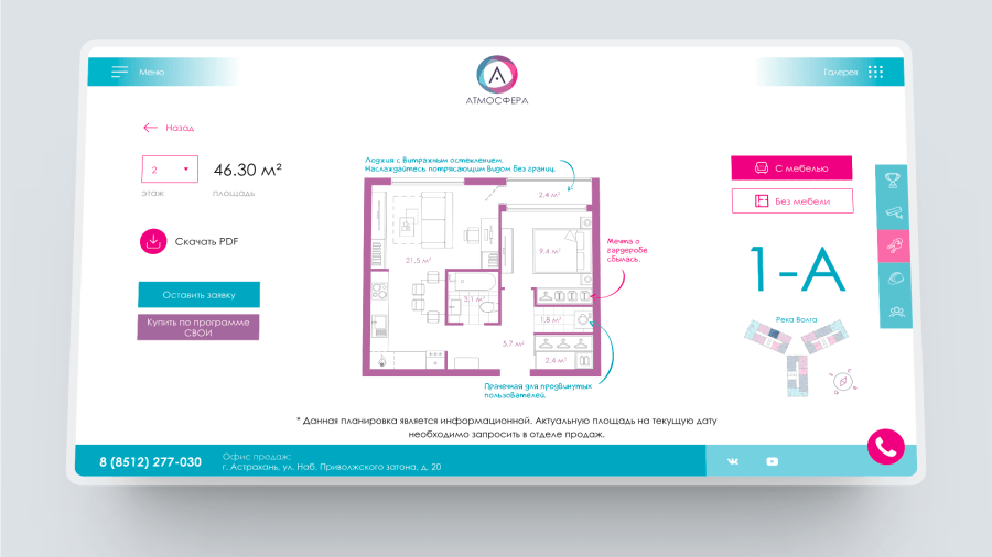 Самый простой и доступный способ — оживить исходную схему планировки интересными деталями или небольшим интерактивом. Например, в ЖК «Атмосфера» можно посмотреть планировку в двух вариантах: с мебелью и без, а ключевые особенности квартиры отмечены надписями: «Мечта о гардеробе сбылась», «Прачечная для продвинутых пользователей», «Лоджия с витражным остеклением. Наслаждайтесь потрясающим видом без границ». С этими деталями чертеж выглядит не так скучно, и пользователю легче представить жизнь в будущей квартире.