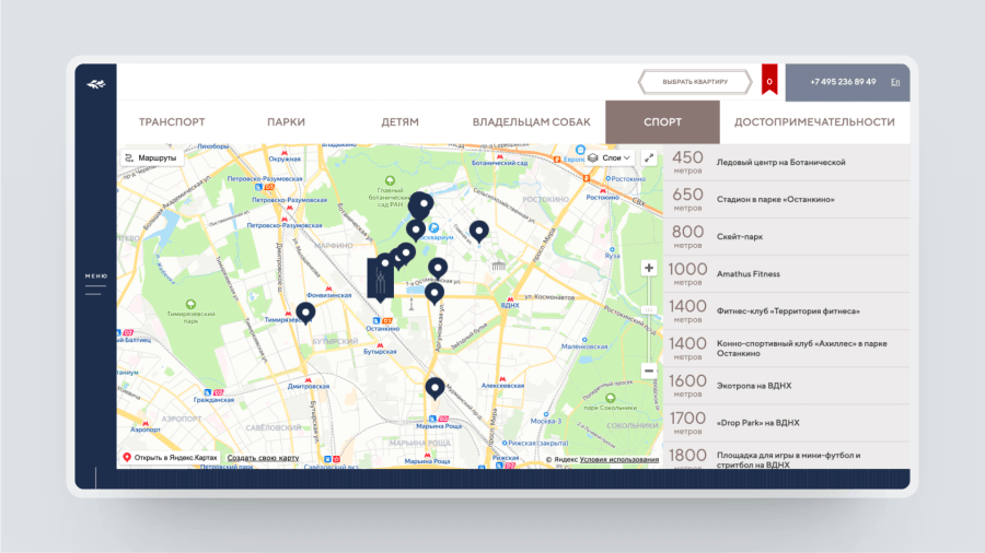 Например, для ЖК «Достижение» «выдающееся расположение» дома «рядом с инфраструктурой, развлечениями и культурными событиями центра Москвы и одновременно вблизи парков и лесов» — это УТП. И карта на сайте наглядно демонстрирует преимущества локации для разных категорий ЦА: можно посмотреть не только ближайшие станции метро, но и какие рядом есть места для отдыха с детьми, прогулок с собакой, занятий спортом и культурного досуга.