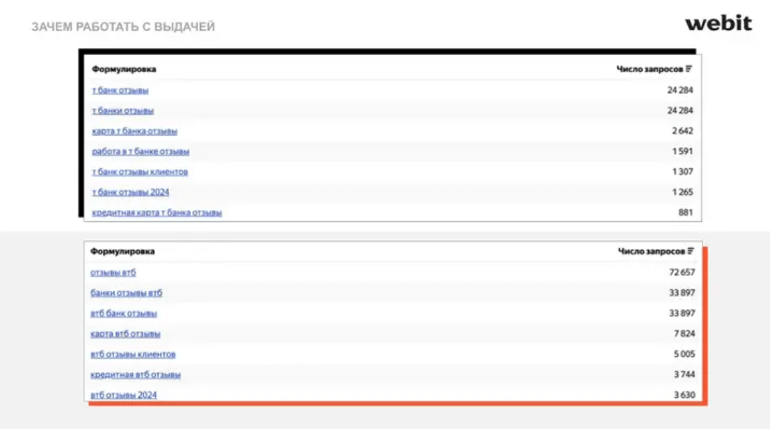 Команда ORM-специалистов Webit прошла пользовательский путь, собрала наиболее популярные запросы, по которым пользователи ищут отзывы о банках, и провела анализ выдачи. По анализу выдачи присвоила каждому банку индекс репутации.