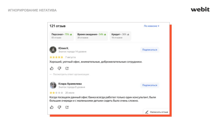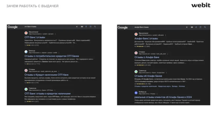 В выдачу могут подтягиваться страницы сайта, и банки показывают именно те отзывы, которые они хотят показать своему потребителю. Многие спорят, что в отзывы на официальном никто не верит и все уже знают, что они ненастоящие. В Webit считают, что лучше все-таки проработать страницы с отзывами. Как минимум, пользователи увидят поменьше негатива, возможного в ТОП-10 выдачи. Для реалистичности картины можно размещать отзывы на 3-4 балла с незначительными минусами.