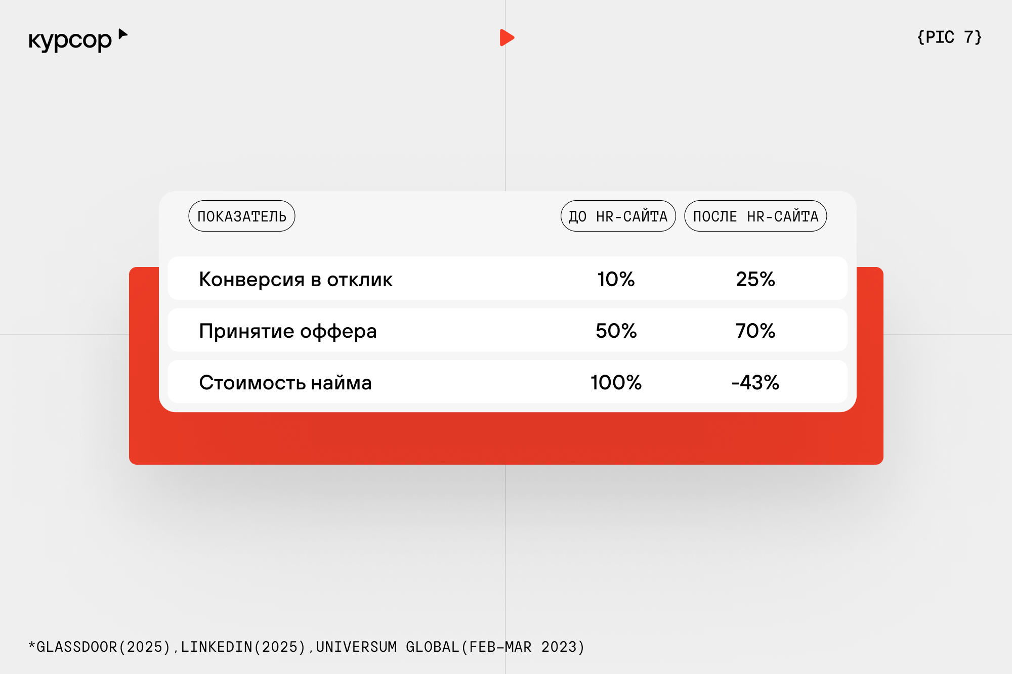 Предположим, человек уже прошел все собеседования, ему отправлен оффер, но молчит, потому что выбирает между несколькими компаниями — именно в этот момент в дело вступает HR-сайт. Он поможет усилить эмоциональную составляющую, покажет команду, культуру и атмосферу, донесет ценности — в общем, поможет «дожать» решение в вашу пользу. Такой лайфхак действительно способен значительно повысить конверсию в принятие.