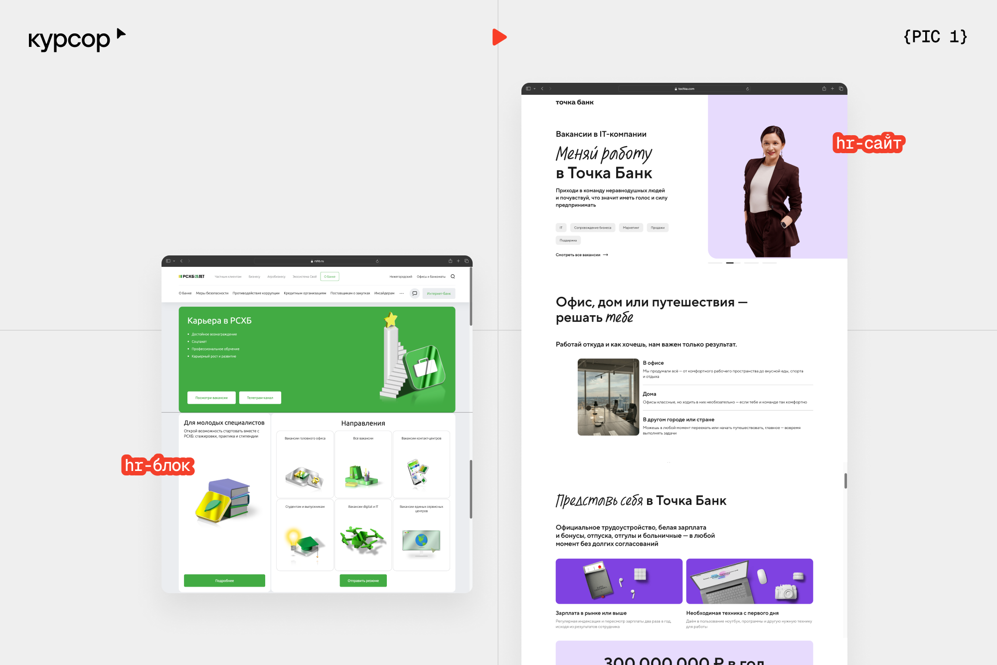 Привет, мы — дизайн-агентство Курсор. Уже больше трёх лет помогаем финтех-компаниям развивать свои HR-бренды: создаём для них HR-сайты, айдентику и внутренние коммуникации, которые помогают не просто нанимать сильных сотрудников, а удерживать их культурой и вайбом.