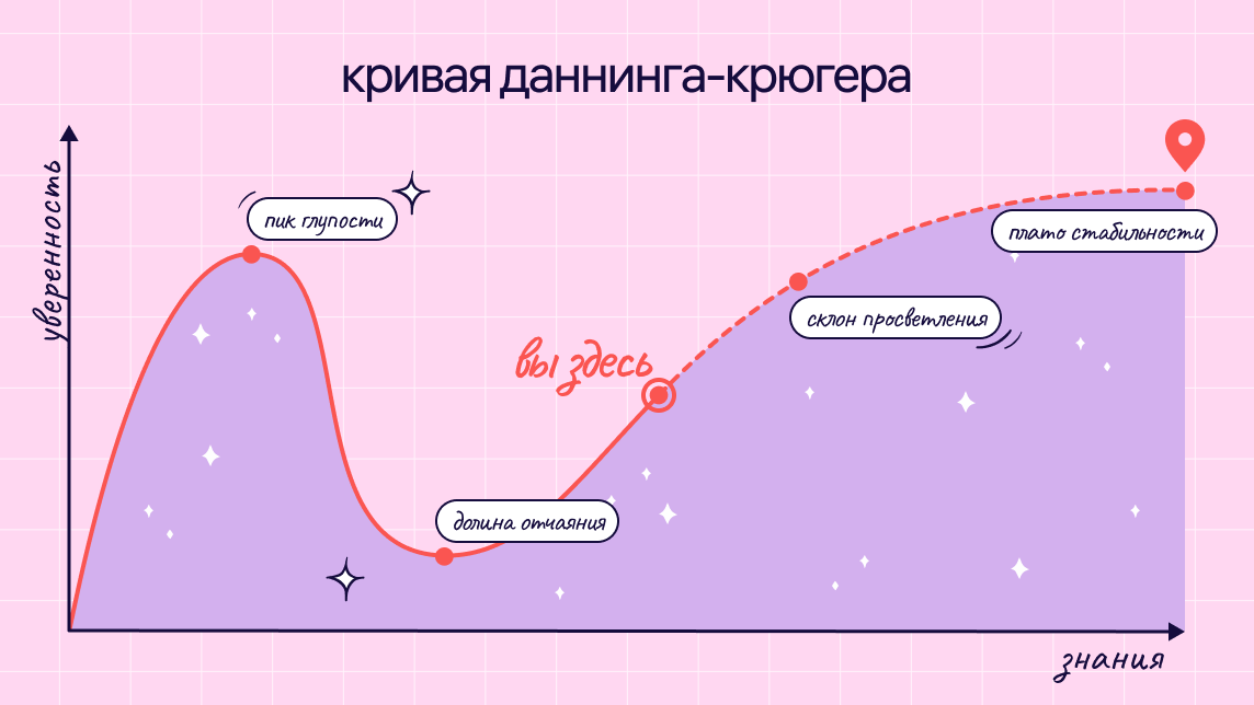 Чтобы чётко понимать свой уровень, не съезжать по кривой Даннинга-Крюгера, и знать, в какой сфере лучше развивать свои компетенции. Попрактиковаться в рефлексии и выявить источник рабочих проблем, научиться ставить достижимые цели, а главное — стать эффективным специалистом.