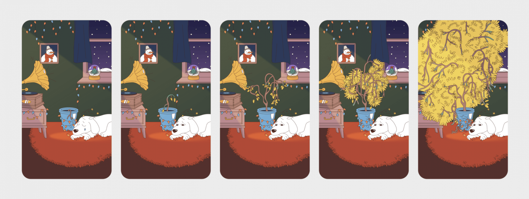 Для дополнительной драматичности в сценарий добавили собаку. Если дерево запустить, собака начинает грустить. Для графики игры мы выбрали несложную стилистику, чтобы не уходить в излишнюю реалистичность, но такую, которая позволяла нам создавать иллюстрации, вызывающие эмоциональный отклик у зрителя. Конечно, мы понимаем, что главные эмоции у игроков вызывали промо-коды и подарки от бренда, а не наша собака.